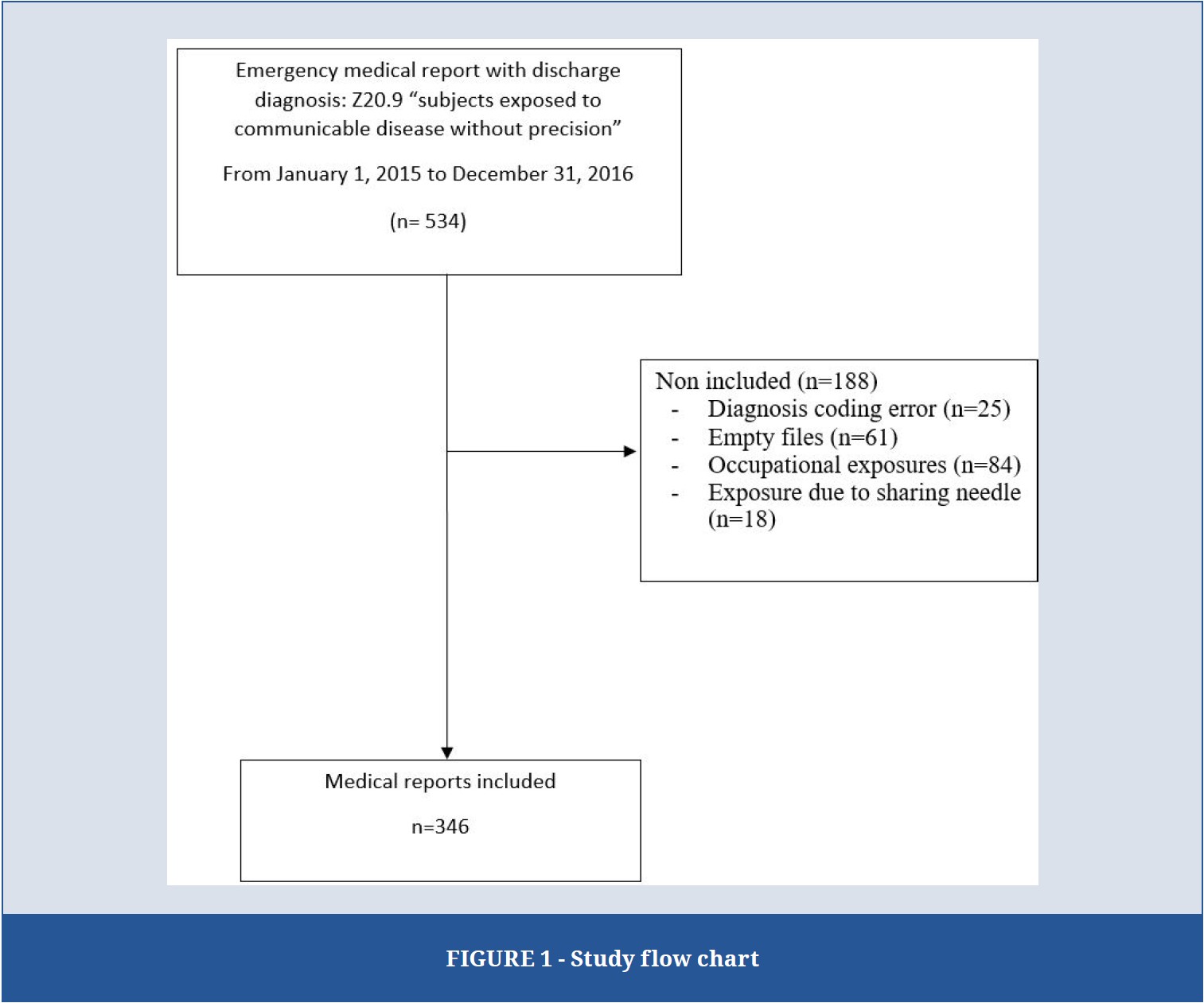 In the evaluated ED, each patient who consults has an electronic medical record. Before discharge, each physician will complete the file and select a discharge diagnosis from a list based on the International Classification of Diseases codes. All pathologies for blood or body fluid exposure are classified under the same code: Z20.9 “subjects exposed to communicable disease without precision”. For the study period, we collected data from charts with a discharge diagnosis of blood or body fluid exposure [16]. We included patients ≥ 18 years old, consulting in the ED for non-occupational HIV exposure (sexual exposure). Therefore, the non-inclusion criteria were age < 18 years, patient left without being seen, patient known to have HIV infection, consultation not related to HIV exposure, patient direct discharge to the infectious disease consultation, and occupational exposure.