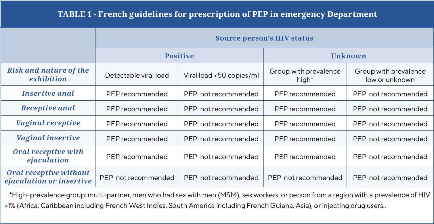 Preventing infection with HIV type 1 (HIV-1) and 2 (HIV-2) remains a major public health challenge [1]. Emergency post-exposure prophylaxis (PEP) is an antiretroviral therapy for people exposed to risk of HIV transmission. PEP should be taken as soon as possible and at the latest, within 48 hrs of exposure [2]. Exposed persons are offered support and quick access to the PEP by hospital emergency services as exposure to HIV occupational and nonoccupational), is frequently managed in hospital emergency departments (EDs) [3, 4]. Guidelines for initiating PEP in EDs are regularly update [5]. The recommendations in France do not differ from those for US, United Kingdom or Italy in terms of risk stratification, the PEP indication primarily is relying on the description of the source partner [6-8]. Since 2011, the number of new cases of HIV diagnosed in France has been stable, about 6.000 per year [9]. Although PEP has real clinical impact, its use has some secondary effects (i.e., liver toxicity, hypersensitivity reactions) [10,11]. As well, in France, the cost of one PEP kit is 800 to 1,000 Euros and completely financed by public funds. Despite the important role of EDs in quelling the HIV epidemic, studies of emergencyphysician prescribing practices is limited [12, 13]. To our knowledge no study has investigated emergency-physician practices in prescribing PEP in France. We hypothesized that emergency physicians over-evaluate the risk of transmission of HIV after nonoccupational body fluid exposure and therefore overprescribe emergency PEP. Our aim was to describe emergency PEP prescription after body fluid exposure (mainly sexual) in a single emergency department.