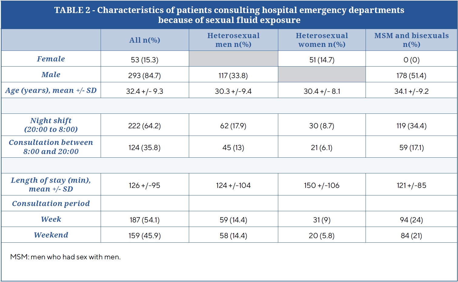 For 51% (n=178) of cases, the sexual orientation of patients was MSM or bisexual; for 34% (n=117), heterosexual men; and for 15% (n=51), heterosexual women. Most patients consulted during the day rather than during the night shift. Consultations did not differ between the week and weekend. The mean length of ED stay was 126 min (SD 95).