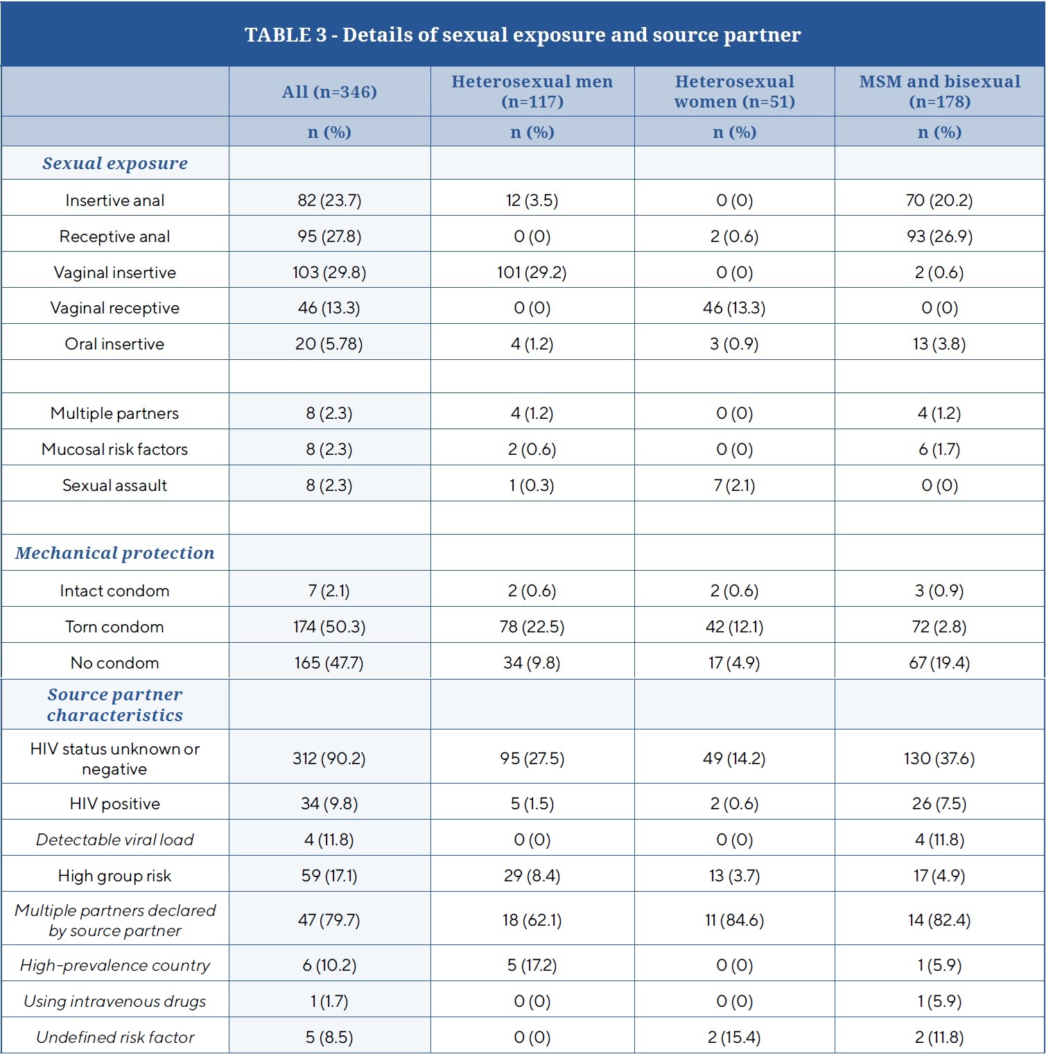 Almost all sexual exposures were with a single partner (n=338; 98%). The most frequent sexual exposures were vaginal insertive (n=103; 30%), receptive anal (n=95; 28%) and insertive anal (n=82; 24%) (Table 3). Half of the sexual exposures involved a torn condom (n=174; 50%). Half of the exposures were due to lack of a condom (n=165; 48%): 34 cases for heterosexual men, 17 for heterosexual women and 67 for MSM or bisexuals. The male condom was the only kind of mechanical protection reported. Seven patients (2%) reported an intact condom and did not have risky sexual exposure. Eight exposures (2%) were in a context of sexual assault. The positive HIV status was known for 10% (n=34) of source partners: 26 were MSM or bisexual, 5 heterosexual men and 2 heterosexual women. The viral load was reported detectable in 4 cases (12%) and unknown in 30 (88%). For 18% of cases (n=59), the source partner was in a high-risk group. The most frequent risk was multiple partners declared by the source partner. Most consulting patients could not say if the source partner had a risk factor (i.e., HIV positive, sharing a syringe, from a country with > 1% prevalence of HIV).
