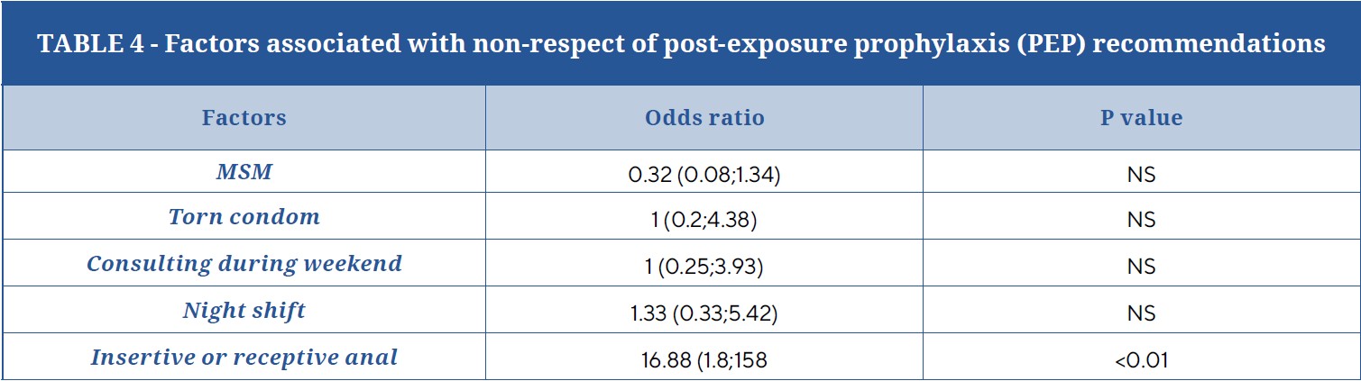 PEP was prescribed for 328 cases (94%). In 33 cases (10%), the indication for prescription was clearly not recommended, but PEP was prescribed for 17 cases (52%). The only factor associated with the nonadherence to the guidelines was the description of anal sex (insertive or receptive) during the sexual exposure (p<0.01) (Table 4).