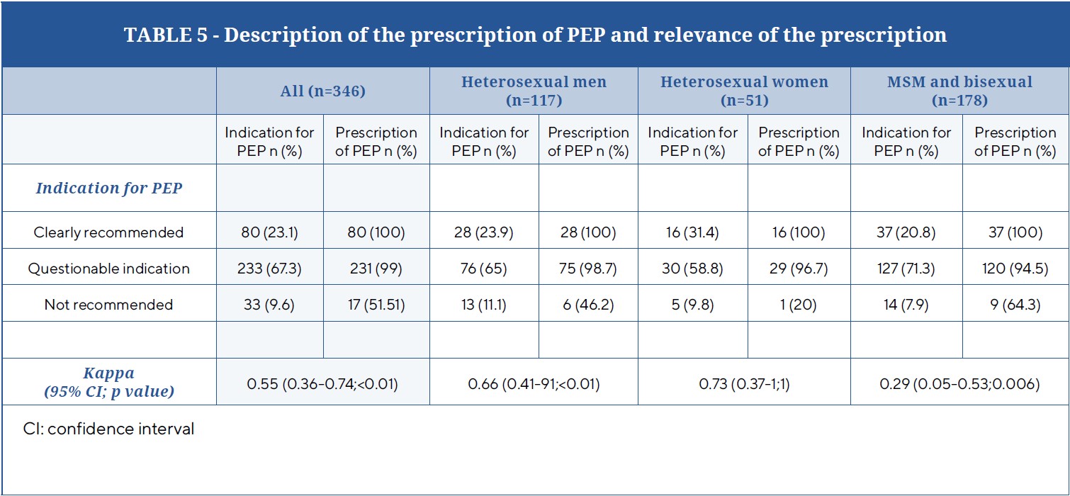 Results: We included 346 patients in the analysis. Half of the patients were men who had sex with men (n=178). The most frequent sexual exposure was anal insertive or receptive (n=177; 51%). PEP was prescribed in 94% of cases (n=328). In 33 cases (10%) the indication for PEP was not clear, but PEP was prescribed in 17 cases (52%). The Kappa value for determining the indication for PEP was 0.55 (95% confidence interval 0.36-0.74), indicating poor agreement for prescription. The agreement was lowest for men who had sex with men: 0.29 (0.05-0.53).